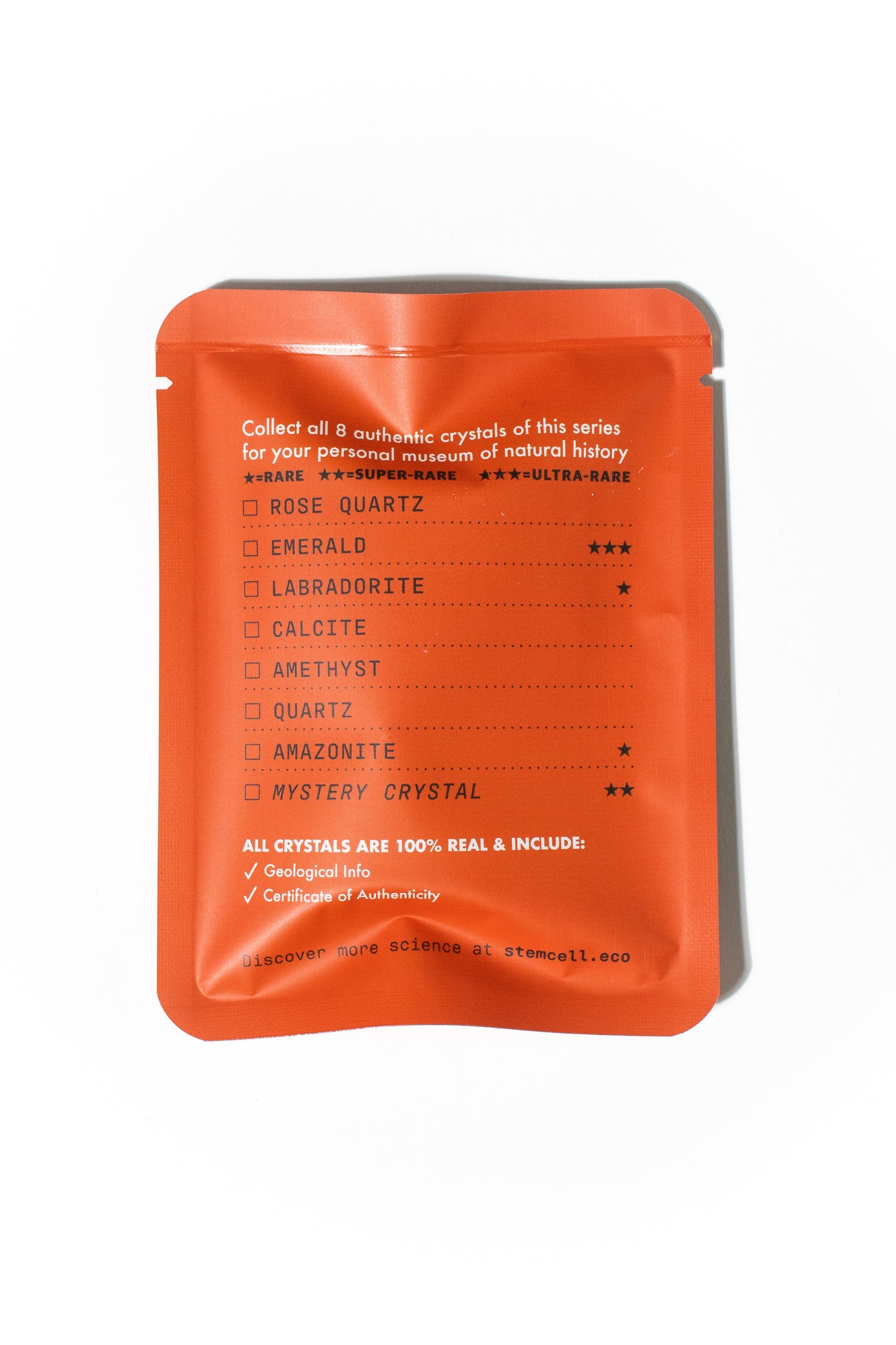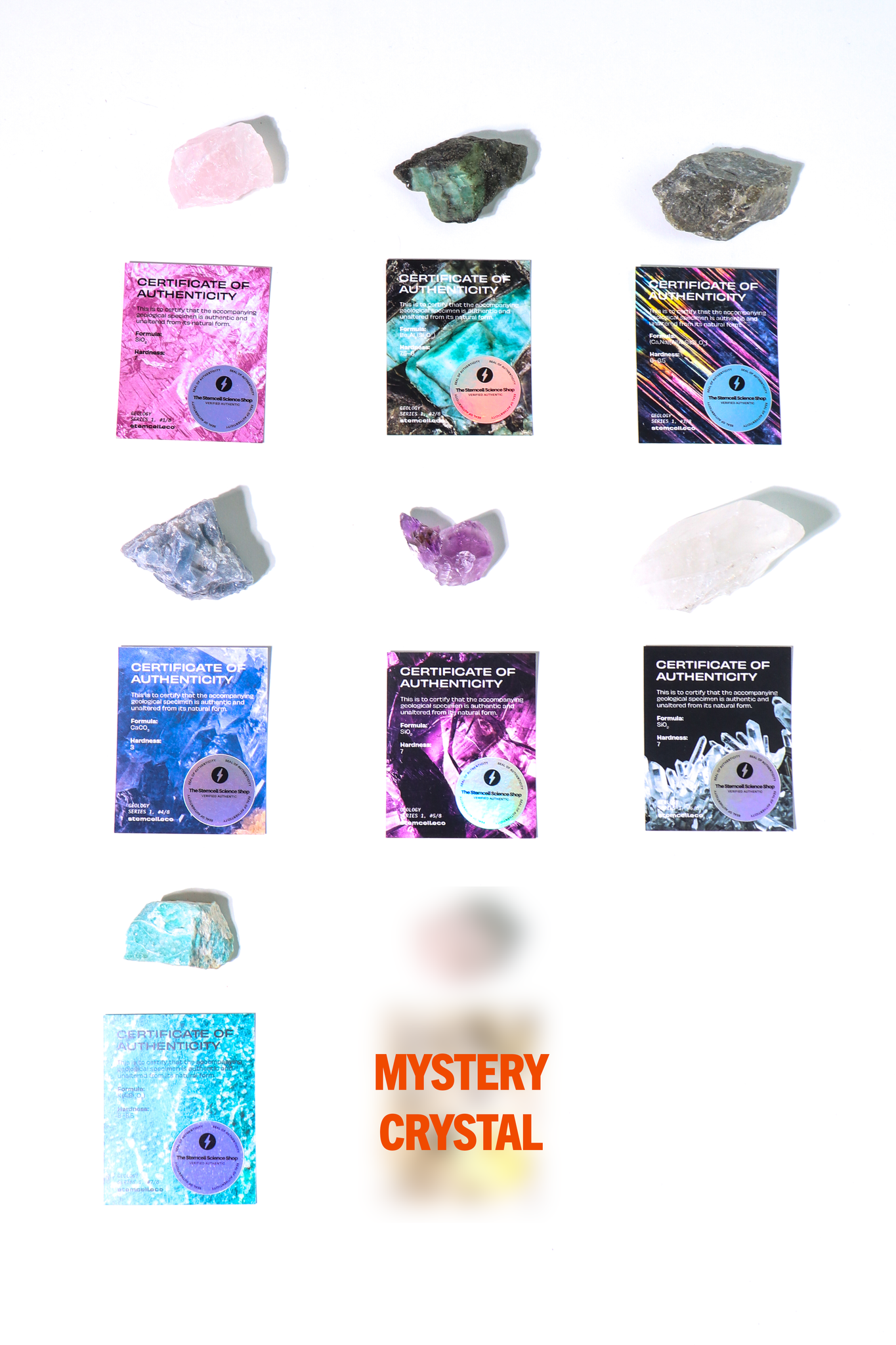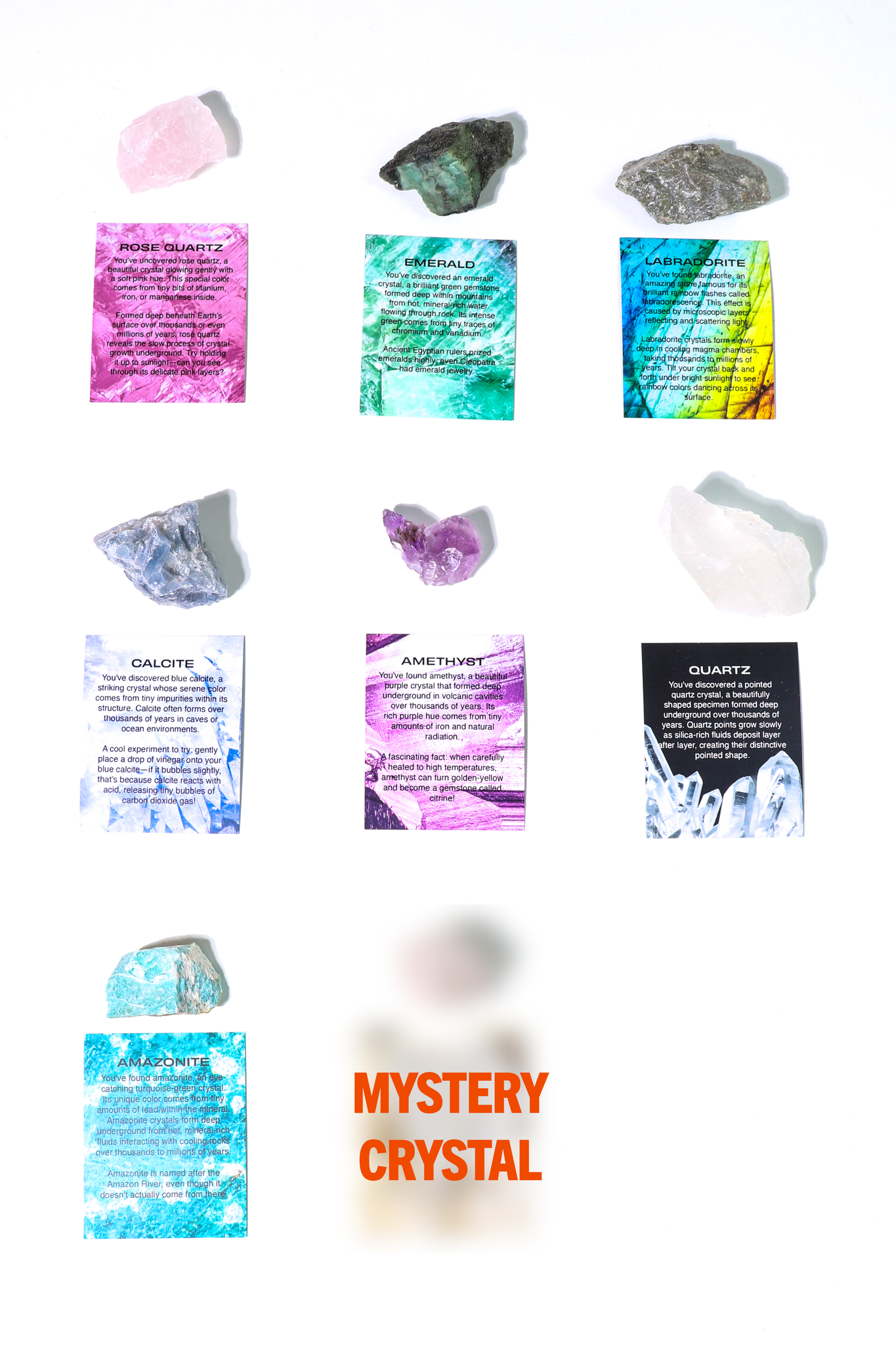 Each bag contains one of eight naturally formed crystal specimens, shaped over millions of years by geological forces beneath the Earth's surface. These are not polished or artificially altered—they’re real minerals, chosen for their beauty, structure, and scientific significance. Every crystal includes an information card and certificate of authenticity.