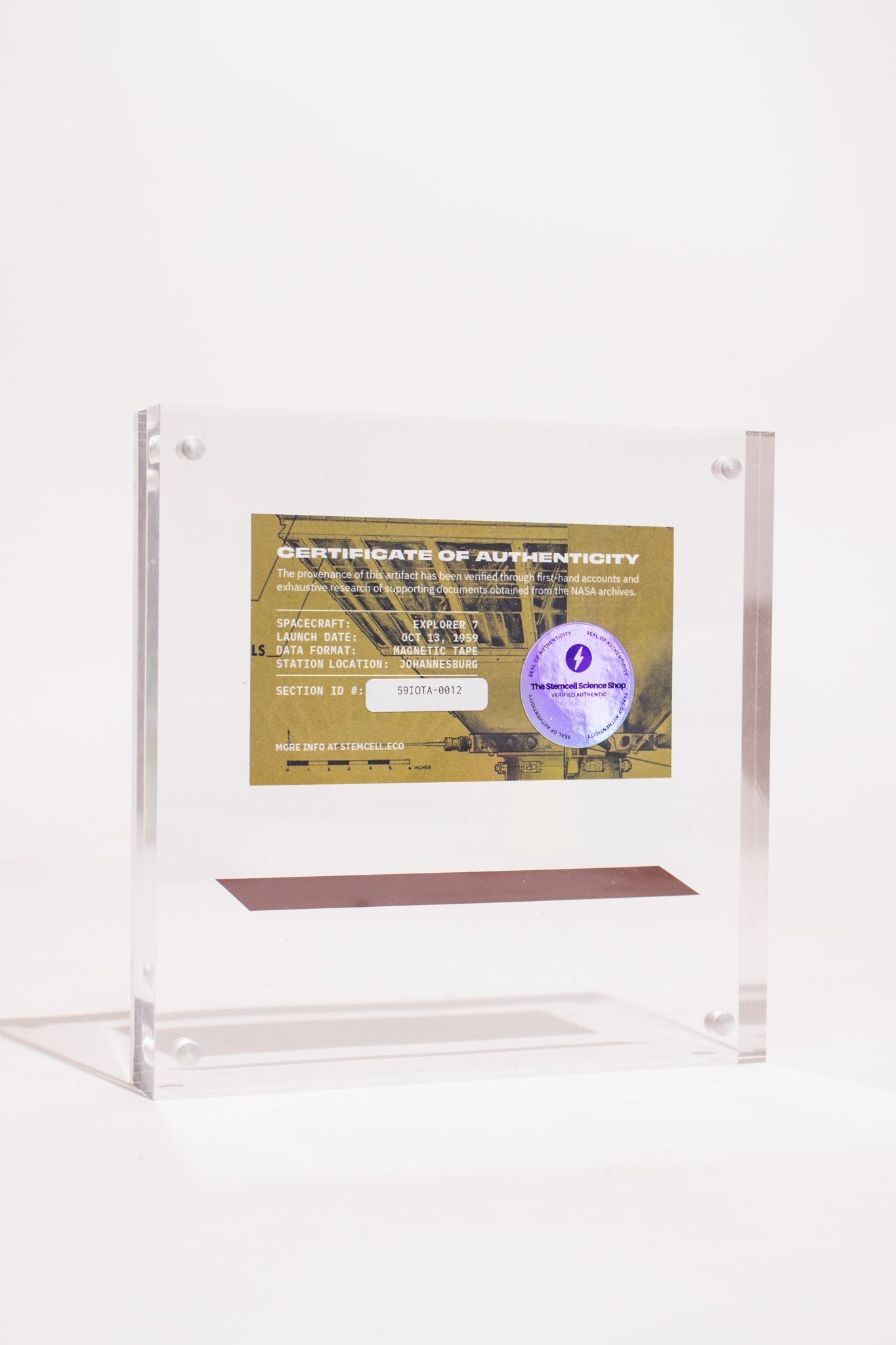 This strip of magnetic tape includes a portion of raw telemetry data for the Explorer 7 satellite. This listing is for a section of tape in an acrylic case that was cut from a larger spool recorded in October 1959.