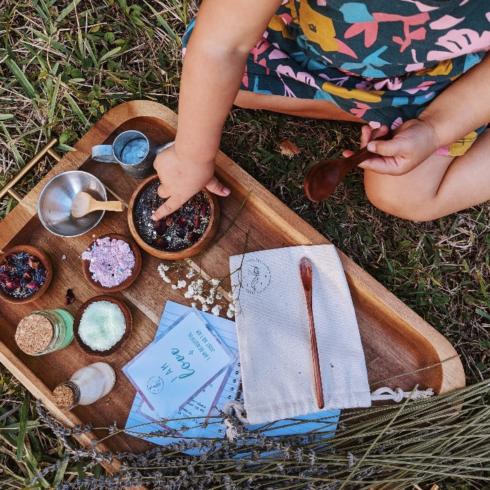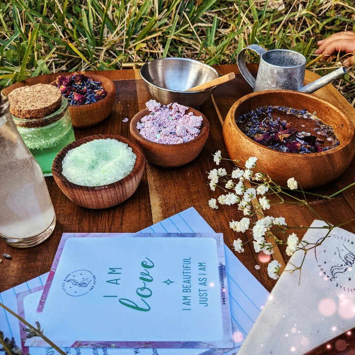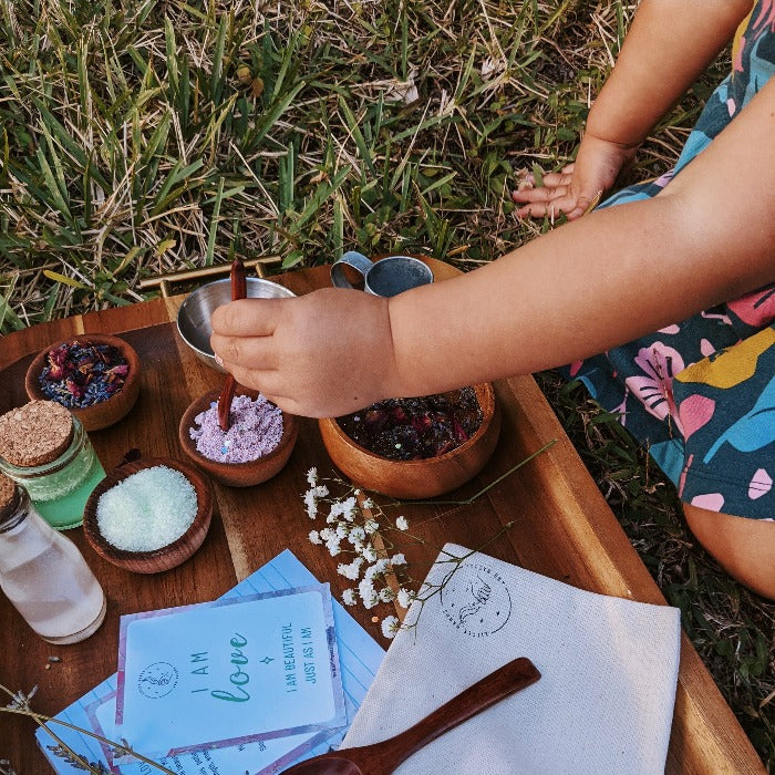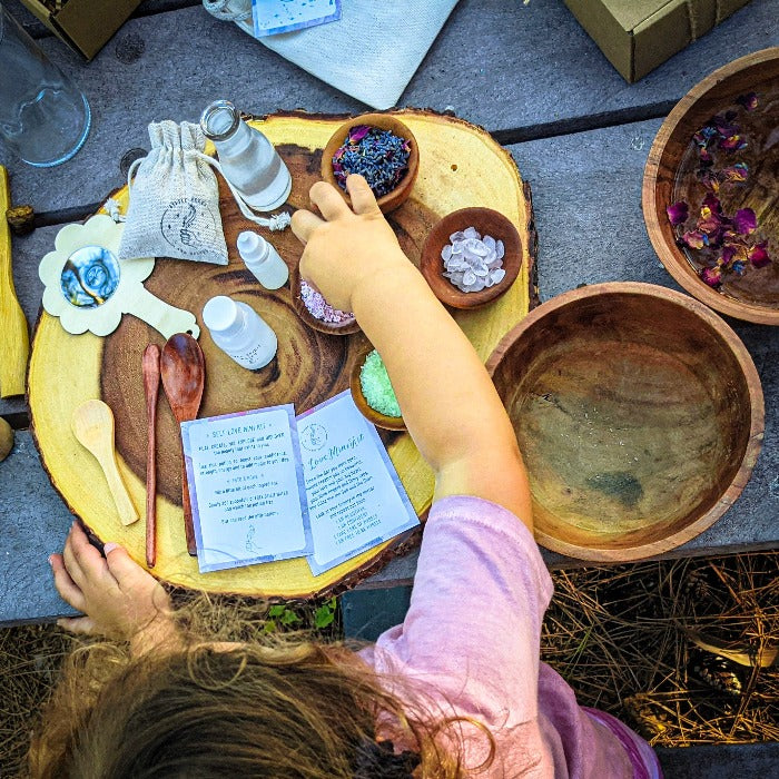 The Self Love Pouch, a portable potion-making kit designed to inspire imaginative play, exploration, and personal growth. Perfect for on-the-go adventures, this enchanting pouch encourages children to have fun, set intentions, and cultivate a positive mindset.